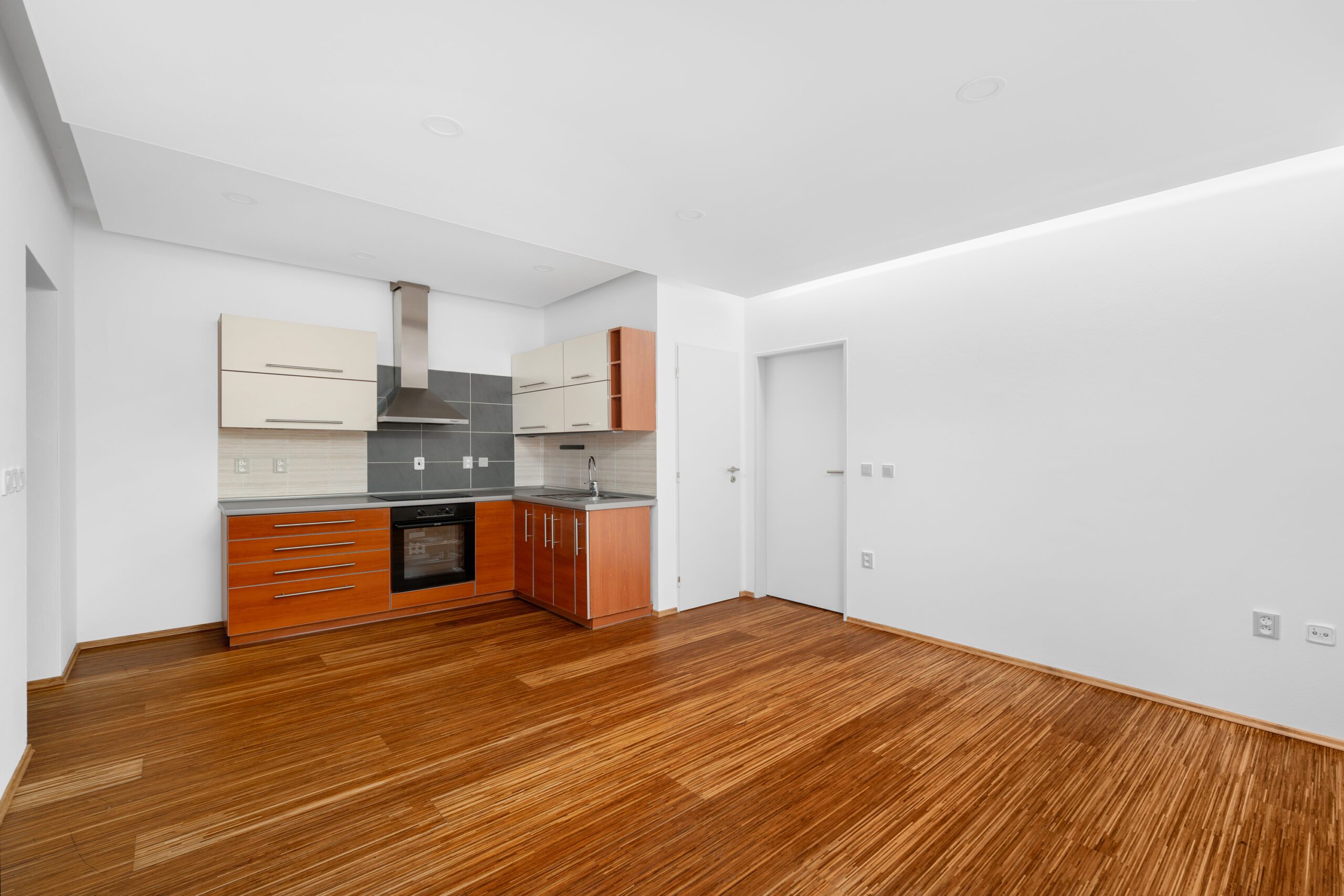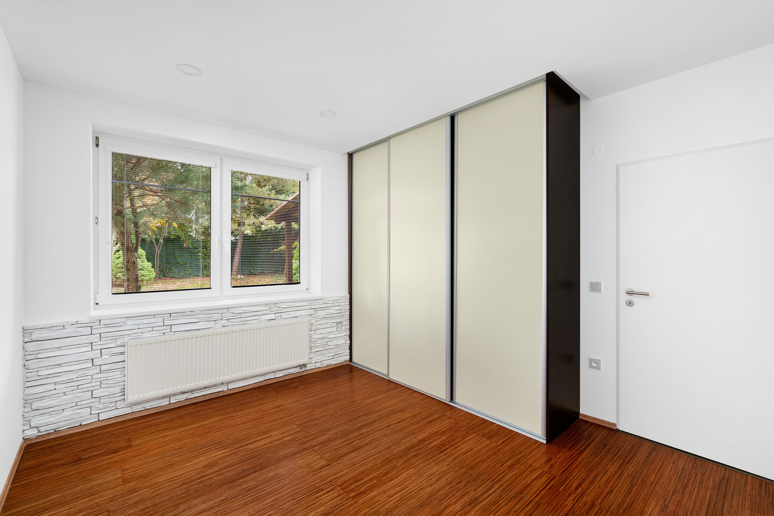 Dispozice je velmi praktická – obývací pokoj s kuchyňským koutem a přímým vstupem na terasu a zahradu, ložnice, koupelna s vanou a toaletou a vstupní chodba. V ložnici jsou k dispozici vestavěné skříně.