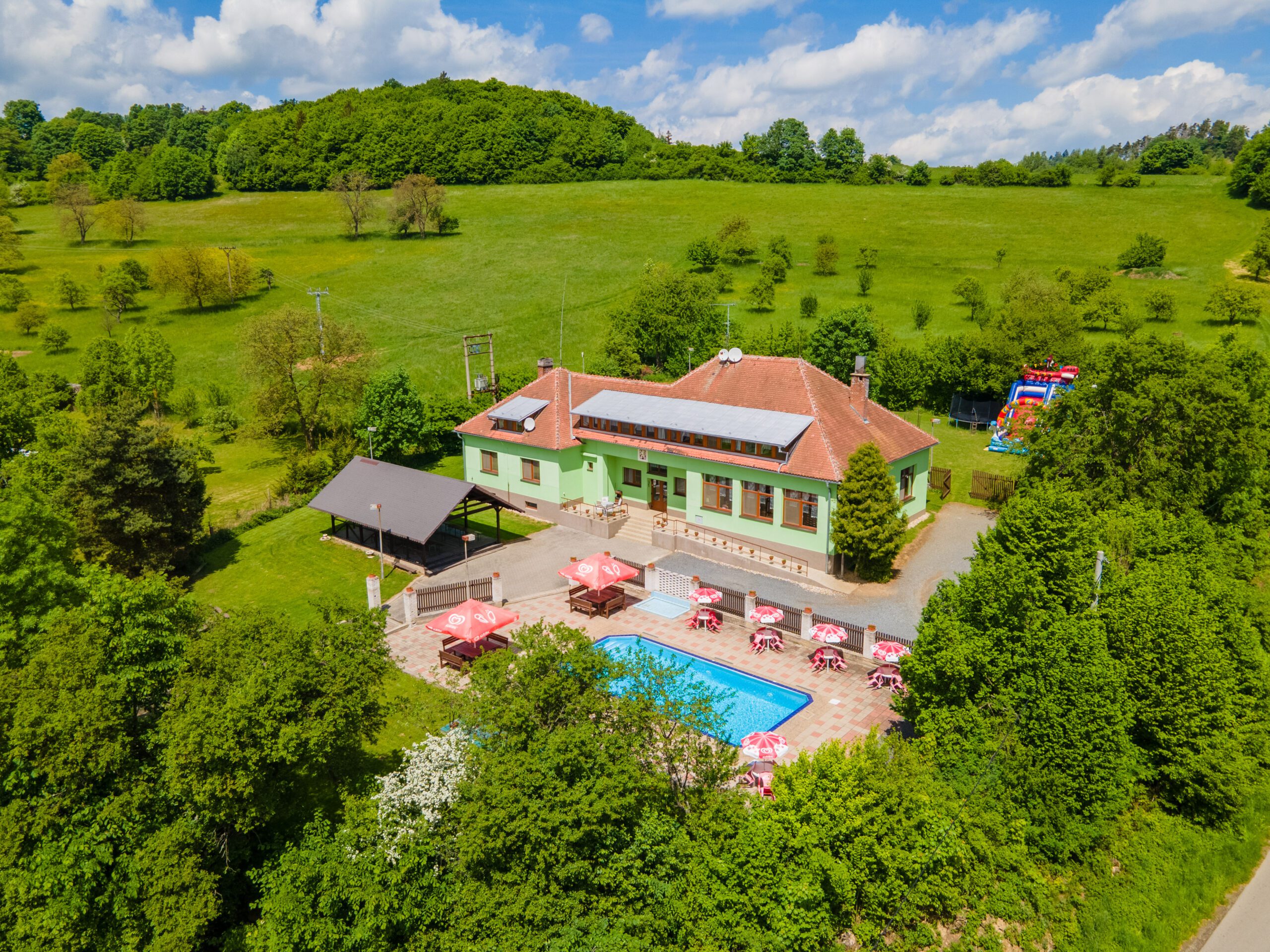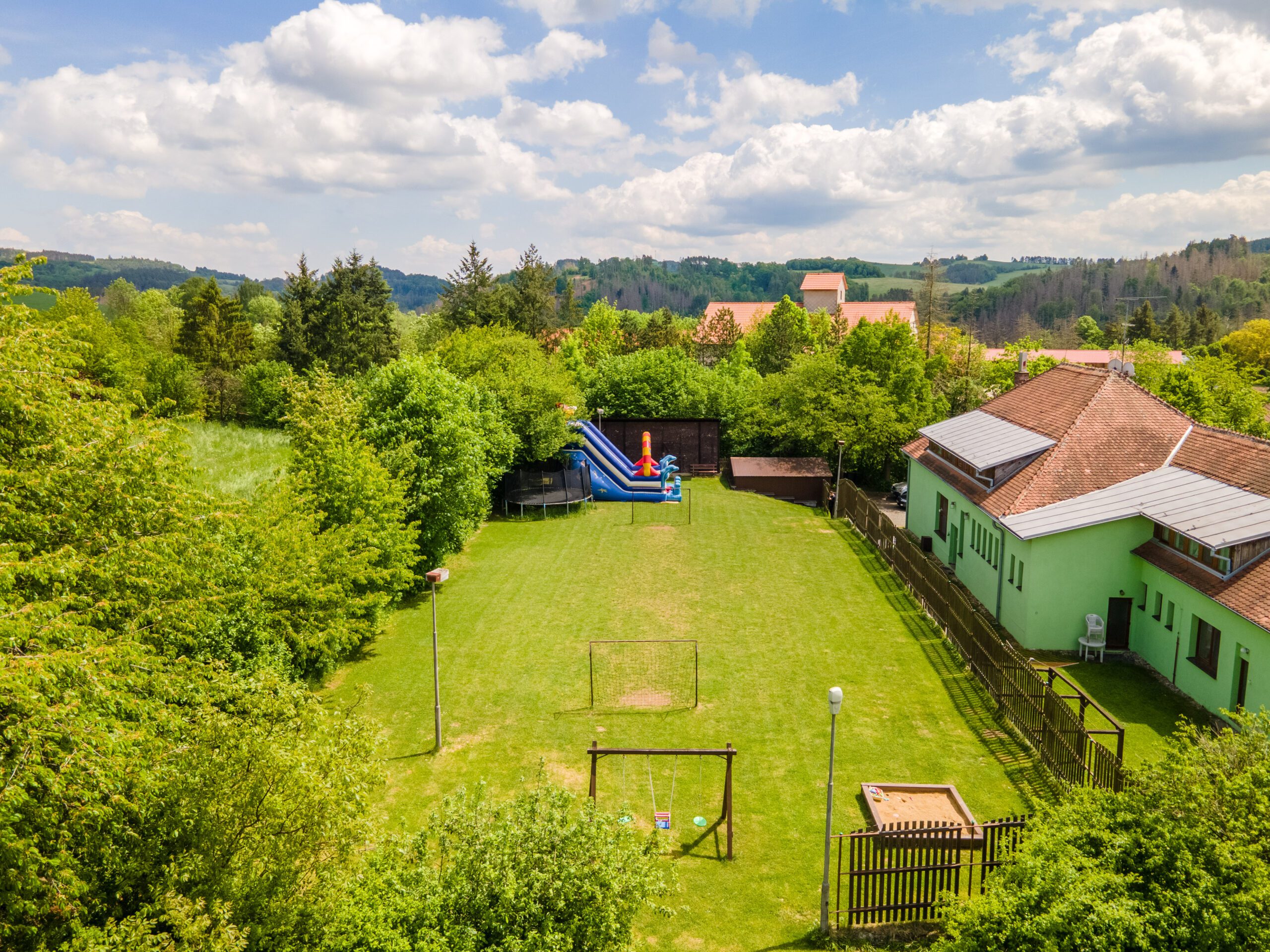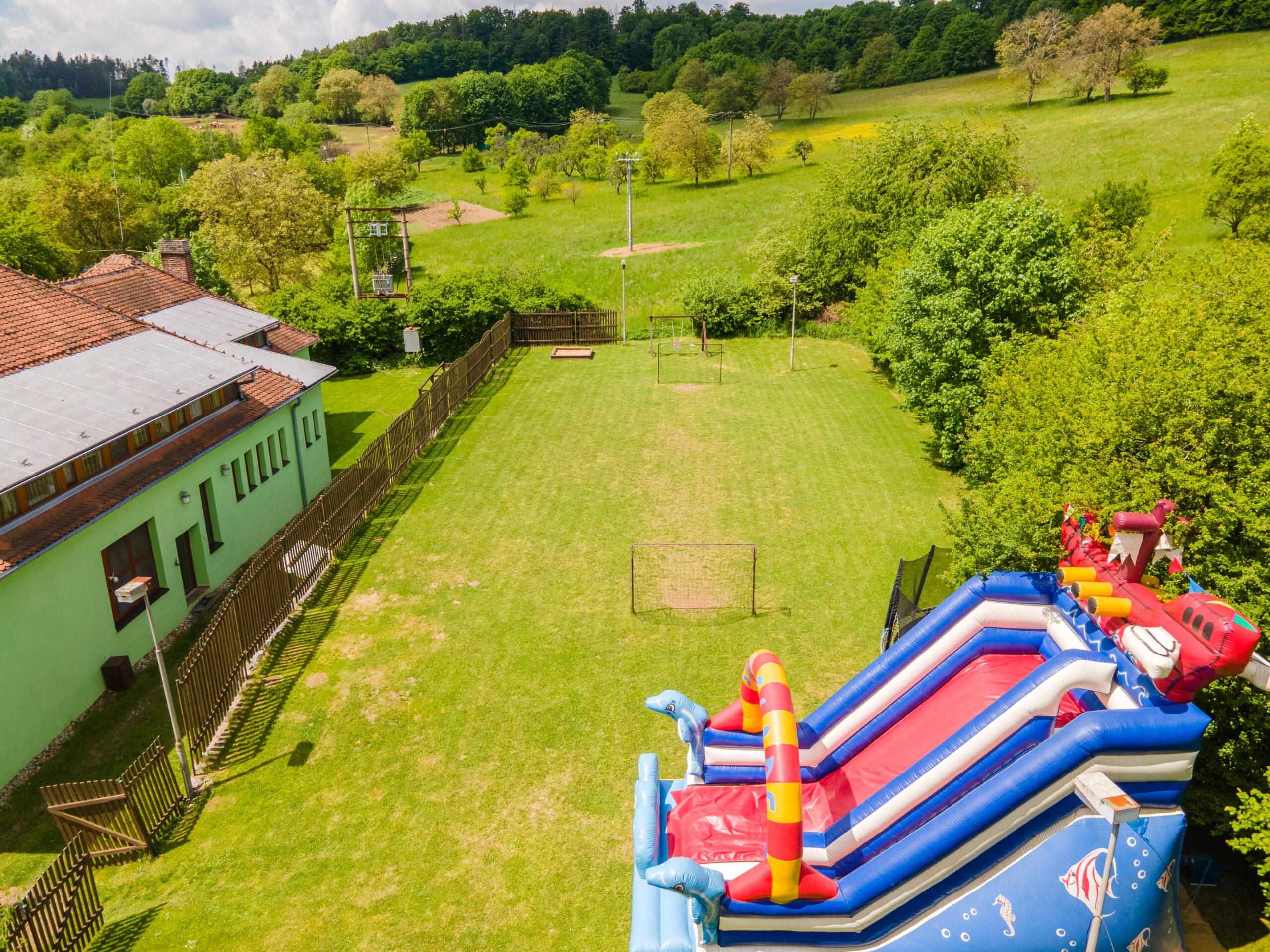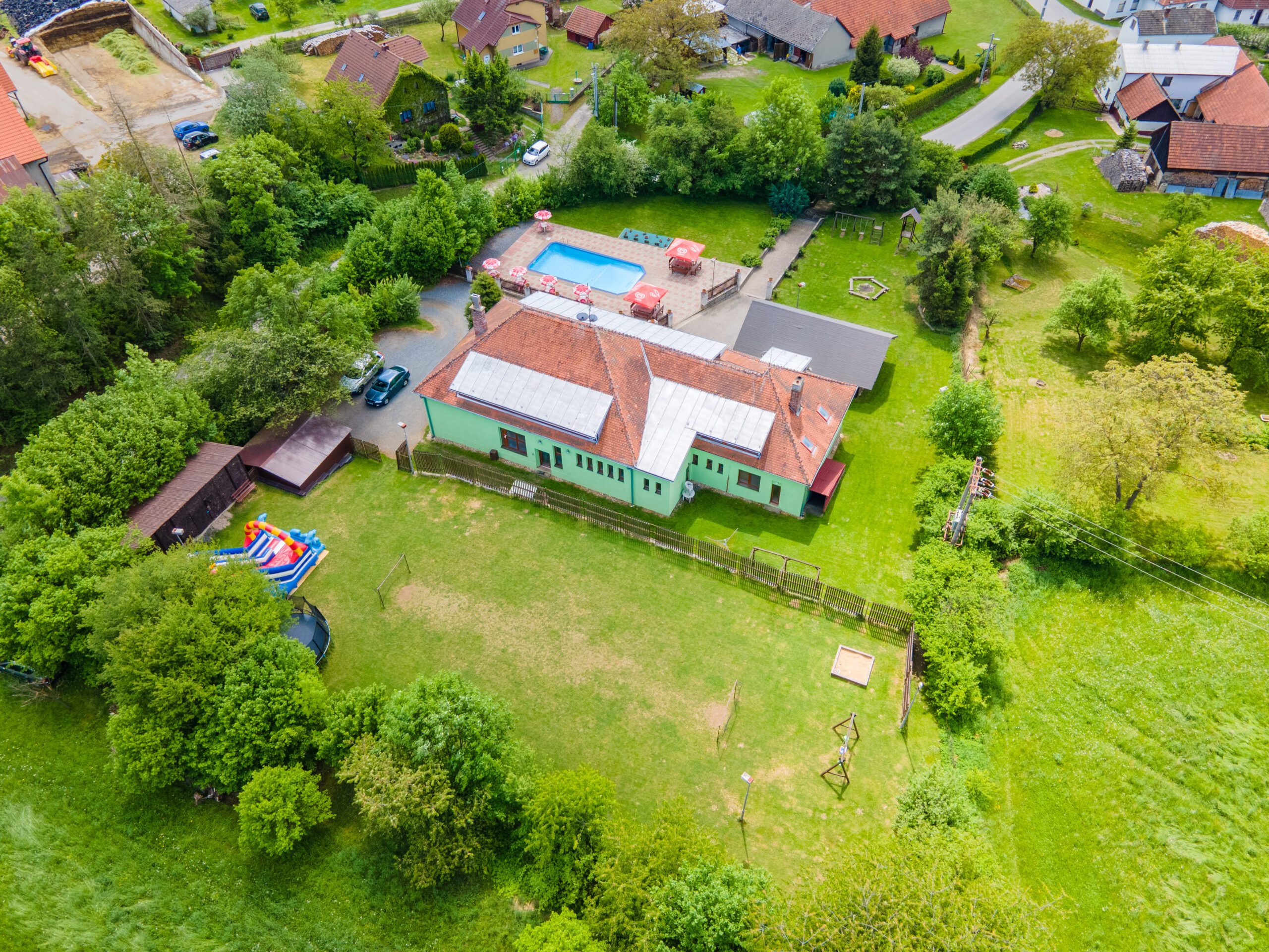 • Dětské hřiště s dřevěnými prvky, trampolína, skákací hrad, ohniště, fotbalové hřiště