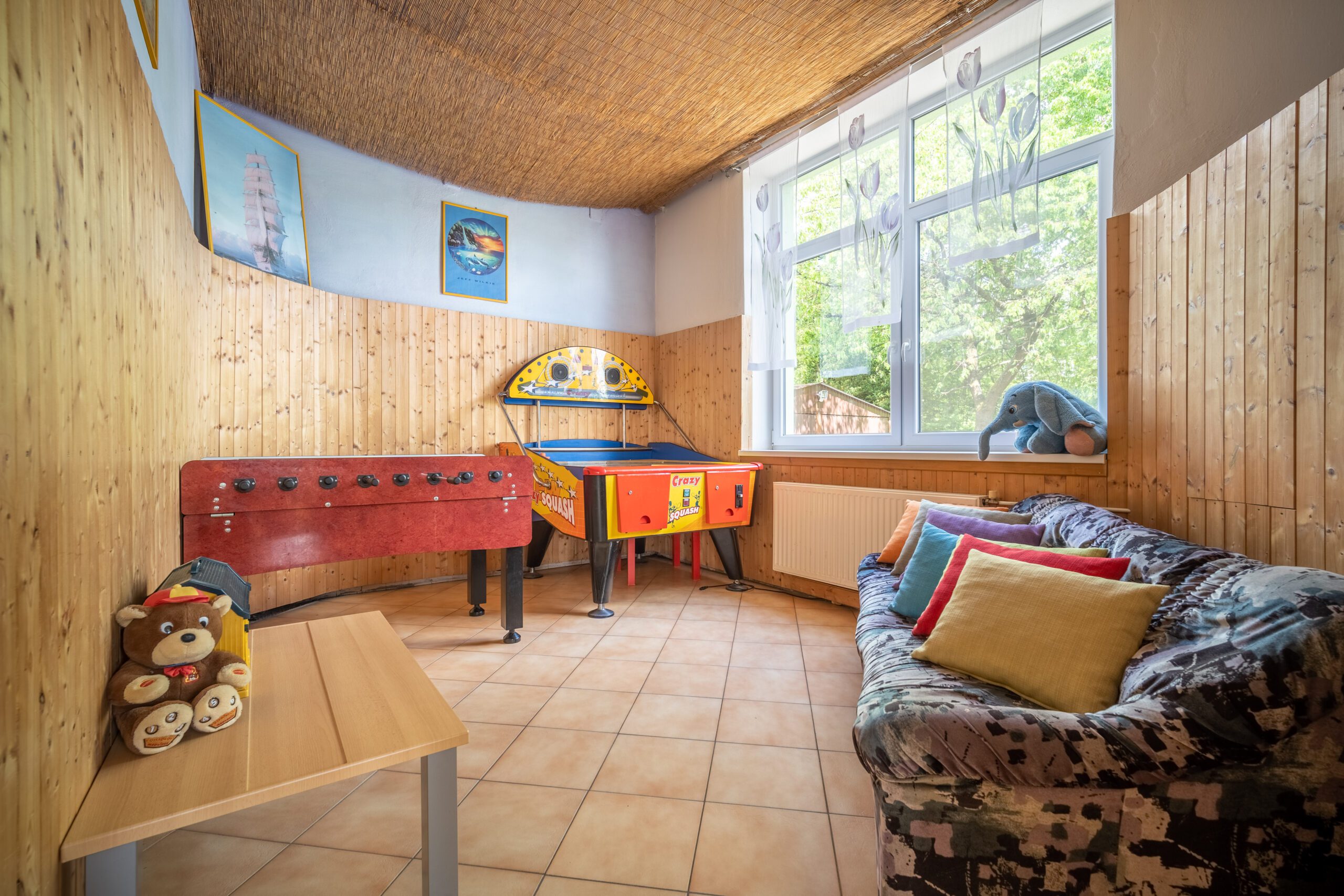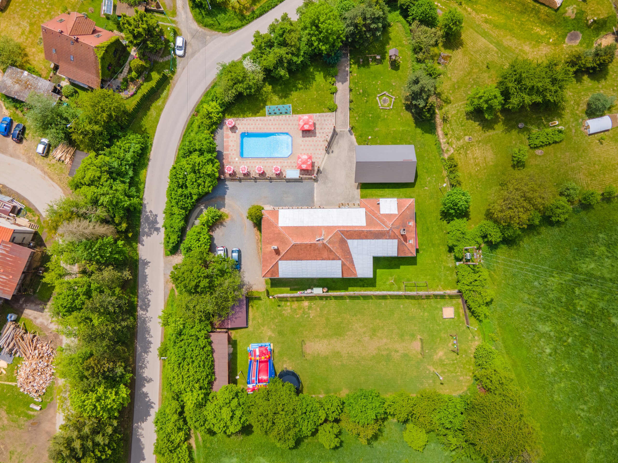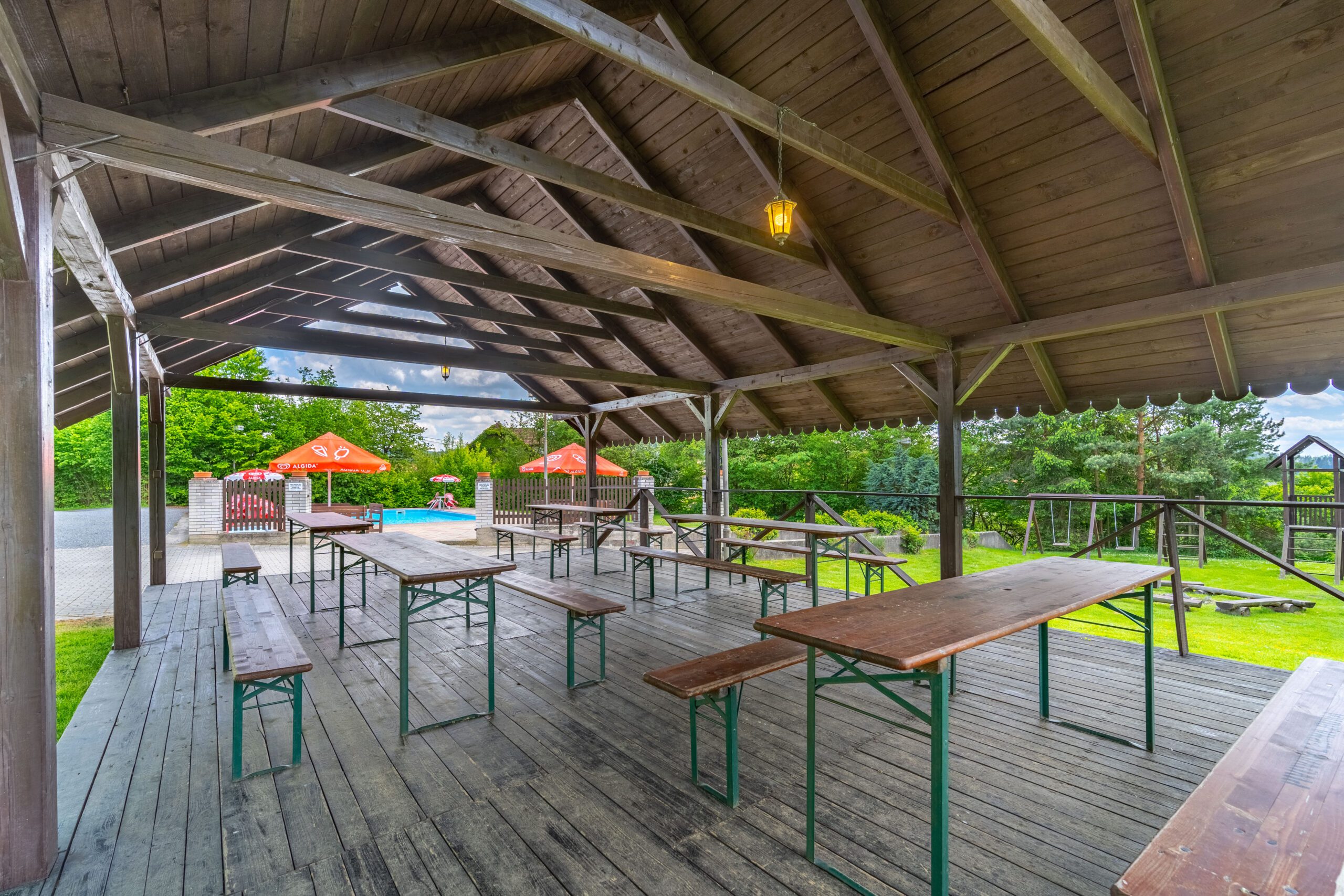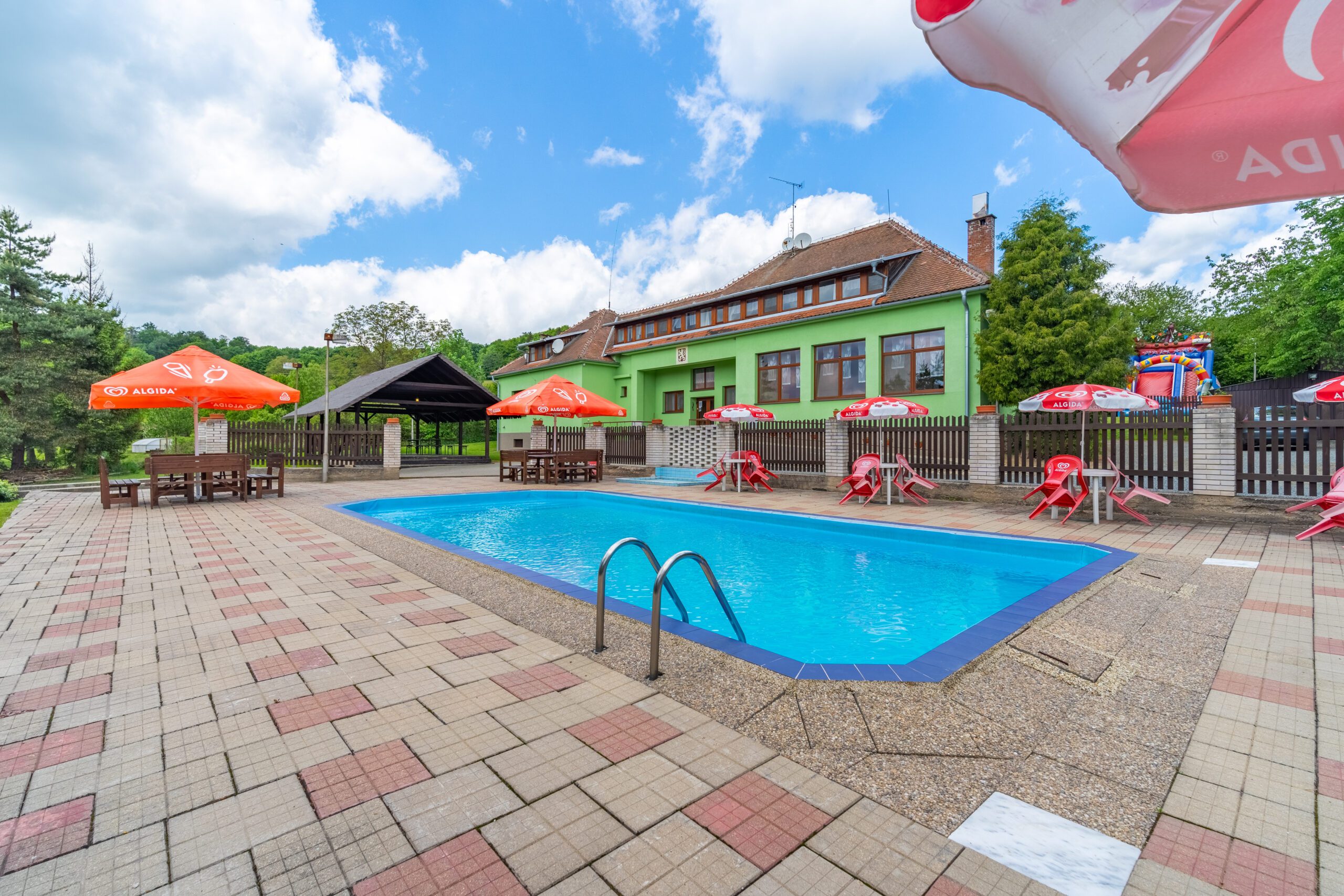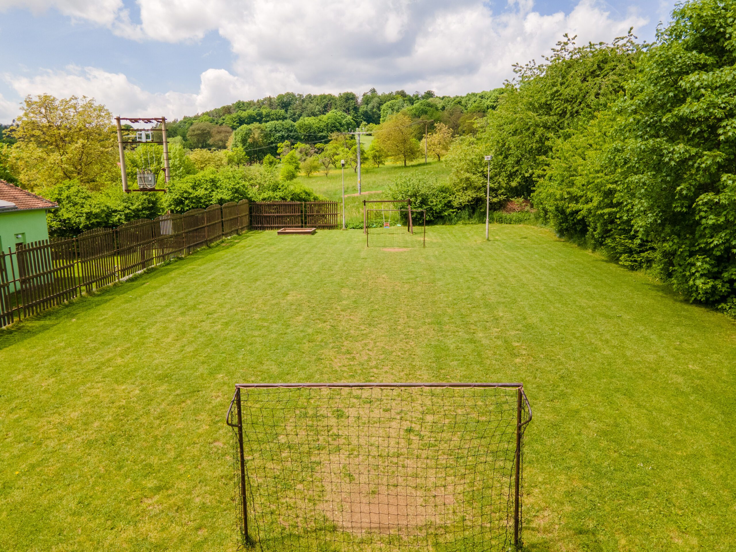 • Dětské hřiště s dřevěnými prvky, trampolína, skákací hrad, ohniště, fotbalové hřiště
