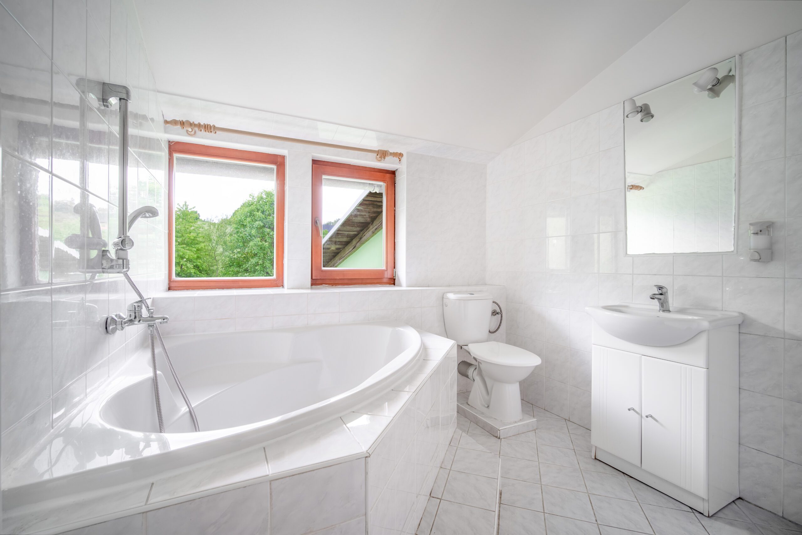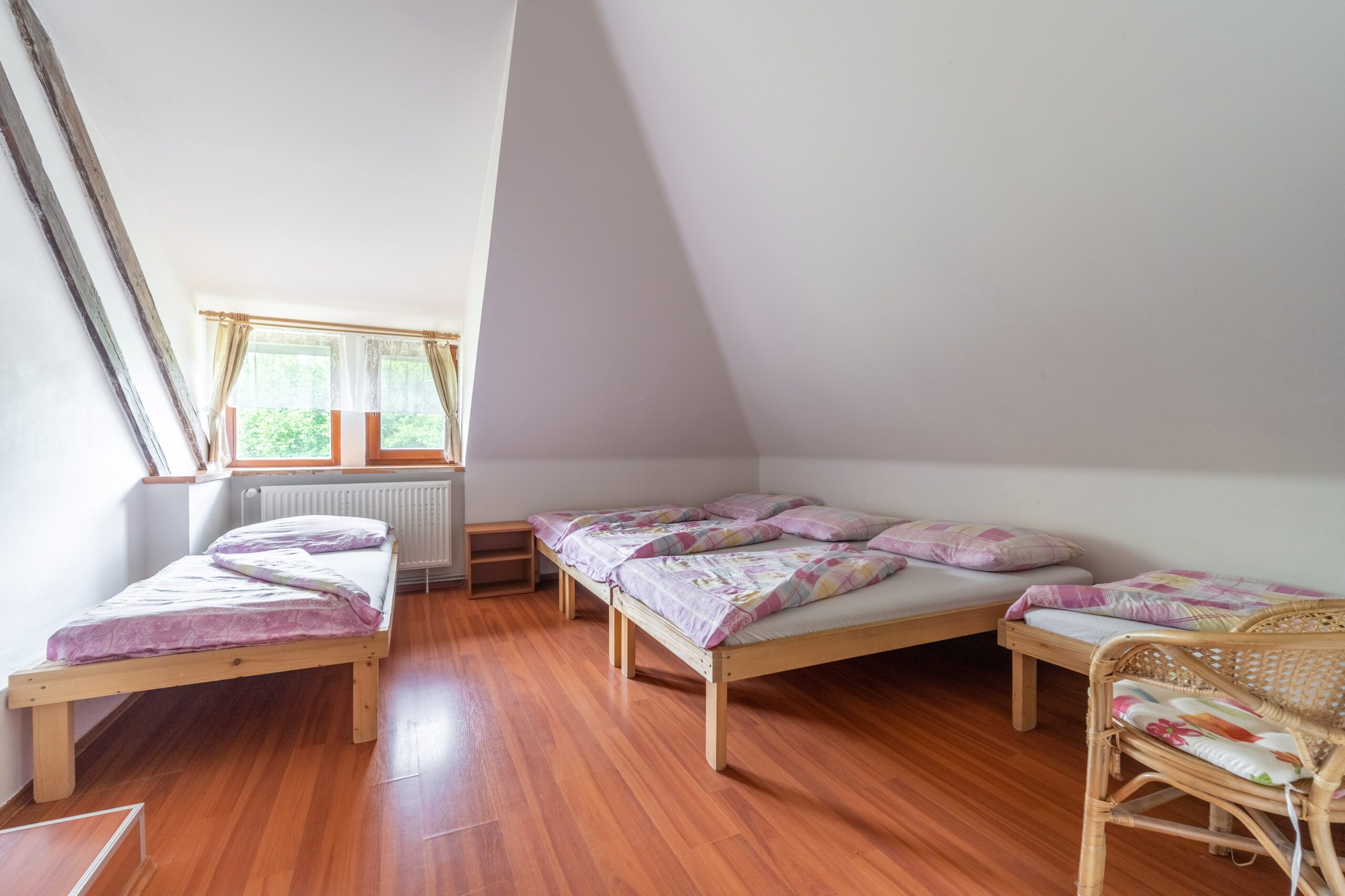 • 8 pokojů v podkroví – každý s koupelnou (vana/sprchový kout, WC, umyvadlo)